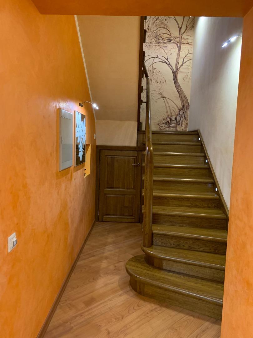 На второй этаж ведет дубовая лестница с подсветкой.